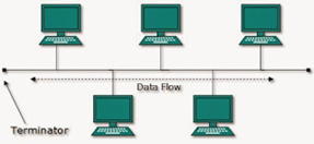 Pada topologi ini biasanya menggunakan satu kabel utama guna menghubungkan tiap titik sambungan pada setiap komputer.
